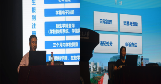 学院开学典礼后举行了新生集中入学教育。学院教学办主任刘军老师对自主选课、课程考核、专业分流、学籍管理及异动处理、出国交流、毕业授位等学籍管理规定进行了讲解。2021级辅导员张秋玉老师对学生日常管理服务、请销假制度、宿舍管理规定、奖励与资助、违纪处分等日常教育管理规定进行了讲解。