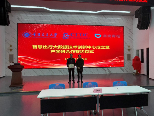 12月24日,bv伟德国际1946与重庆中交通信信息技术有限公司、杭州青奇科技有限公司举行“智慧出行大数据技术创新中心”成立暨产学研合作签约仪式。重庆中交通信信息技术有限公司总经理徐超忠、总经理助理张世建、市场经理牟冬晨,滴滴两轮车事业部西南大区政府事务经理赵钰莹、重庆城市经理文磊、重庆城市运营经理李小明,伟德victor1946产学研处处长冯瑞胜,科技处副处长李文杰,交通运输学院副院长刘唐志,信息学院党委书记胡浩、院长杨建喜、正处级组织员郑廷友、院长助理蒋仕新出席仪式,信息学院院长助理蒋仕新主持仪式。