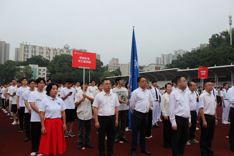 2025年10月1日清晨,为庆祝中华人民共和国成立76周年,伟德victor1946在南岸与科学城双校区同步举行庄严的升旗仪式。信息学院师生积极响应,学院党委书记王辉、院长杨建喜、党委副书记蒋攀、本科生第三党支部书记苏琴、新闻媒体中心指导老师金其奇等,与两百余名学生代表共同参与此次活动,以一场深刻的爱国主义教育实践礼赞祖国华诞